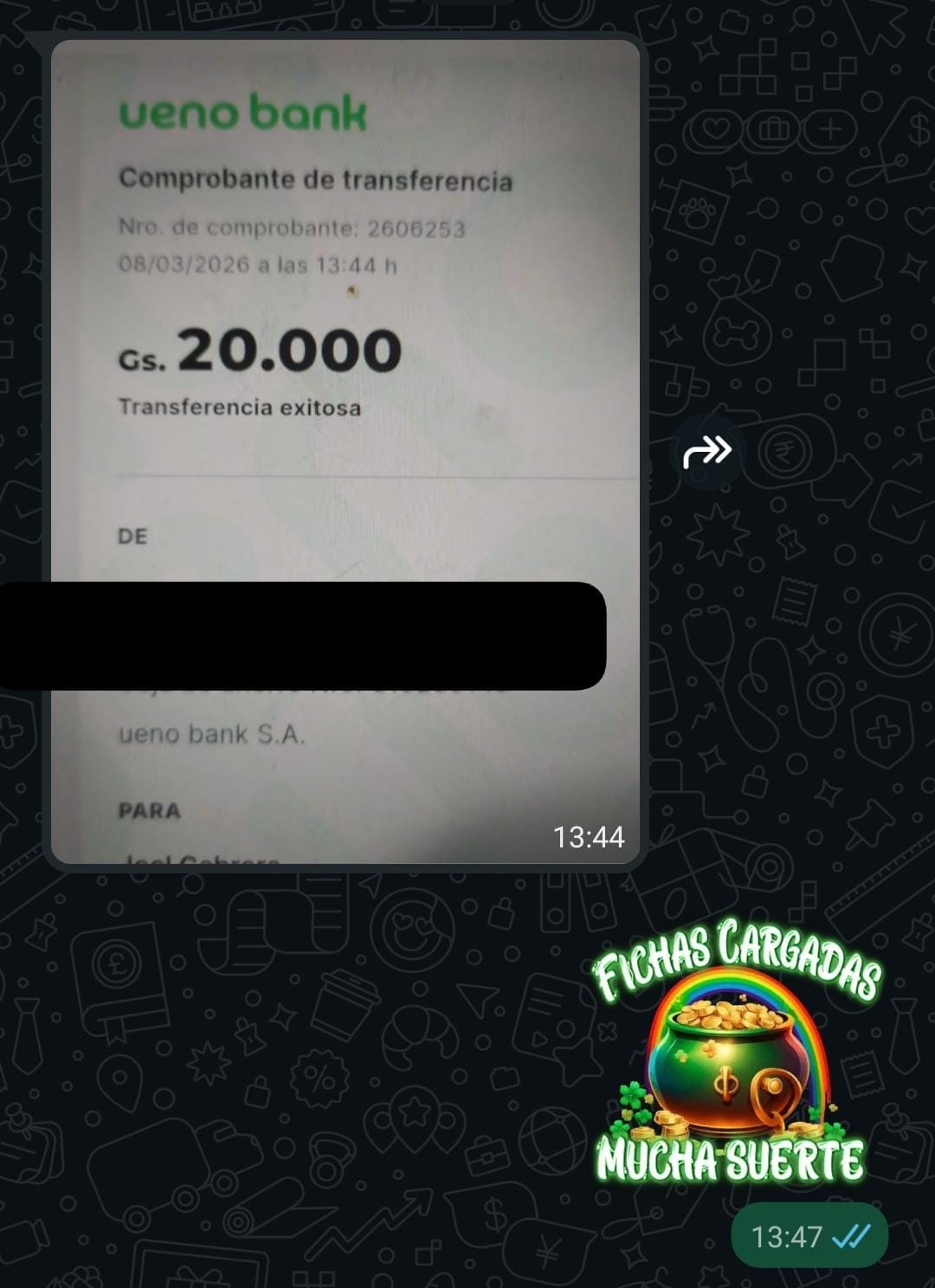 Nos enviás el comprobante y te acreditamos las fichas en tu cuenta